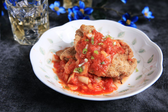 그 위에 미리 만들어 놓은 스테이크용 토마토 소스를 얹어 완성한다.
